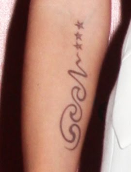 Finalement assez loin des traditionnels tatouages de stars basiques (étoiles filantes, lettres chinoises, et autres dauphins), le tattoo d’Heidi Klum possède un graphisme original, avec une écriture mystérieuse et assez importante, son tatouage couvrant tout l’intérieur du bras. Le visuel se termine par 4 petites étoiles